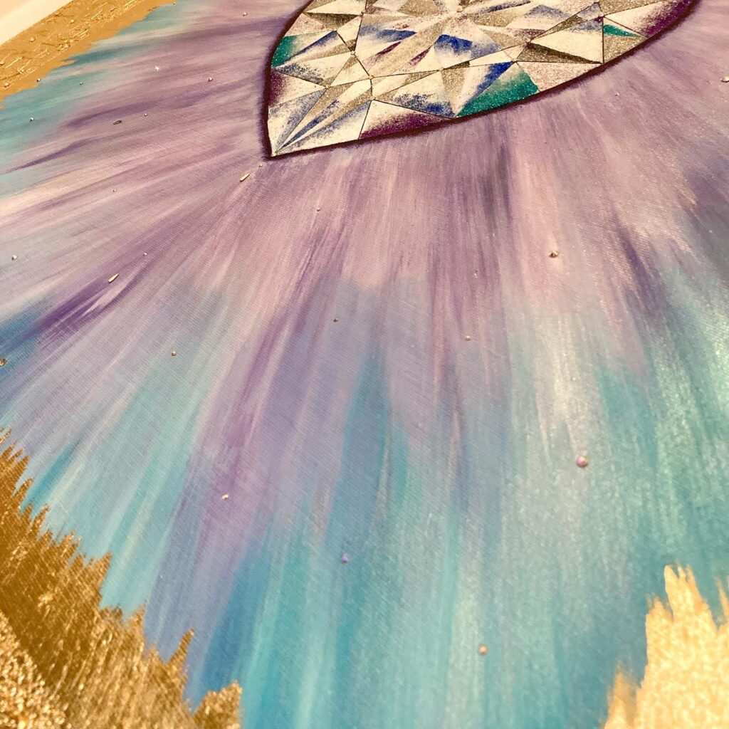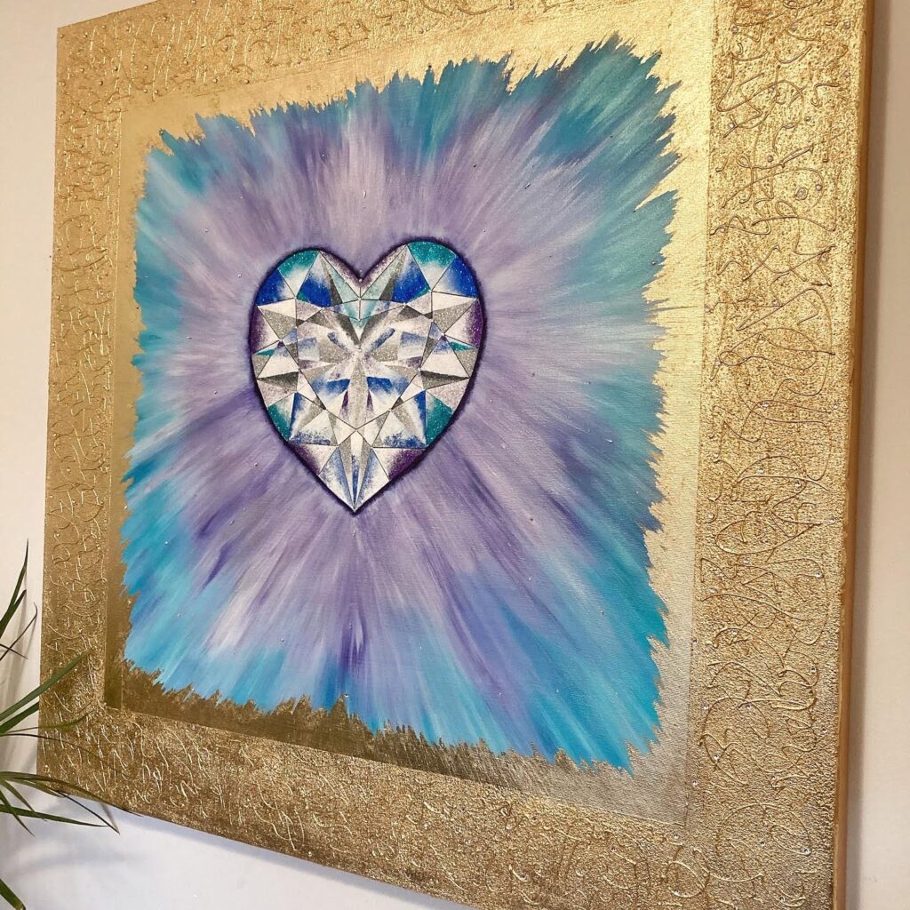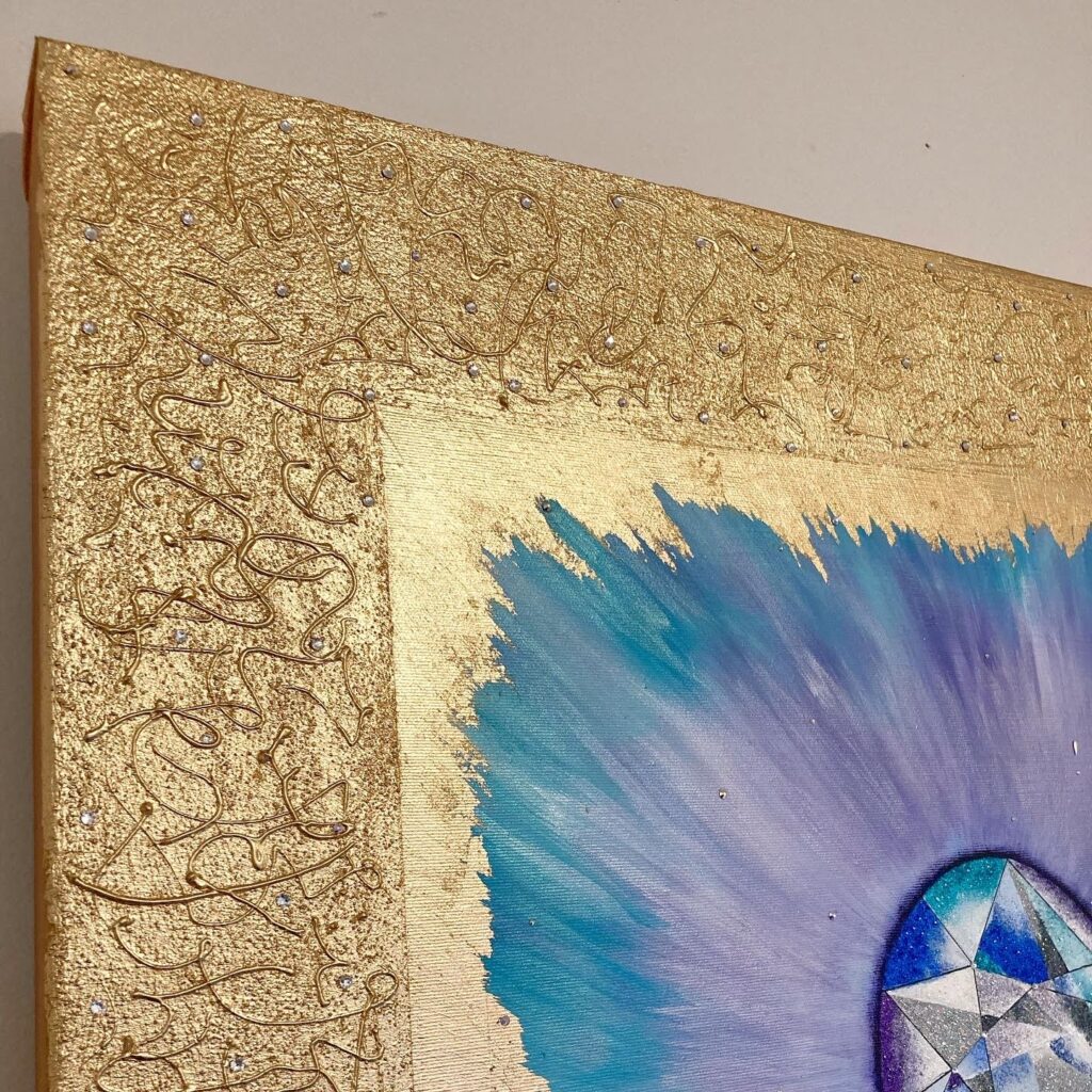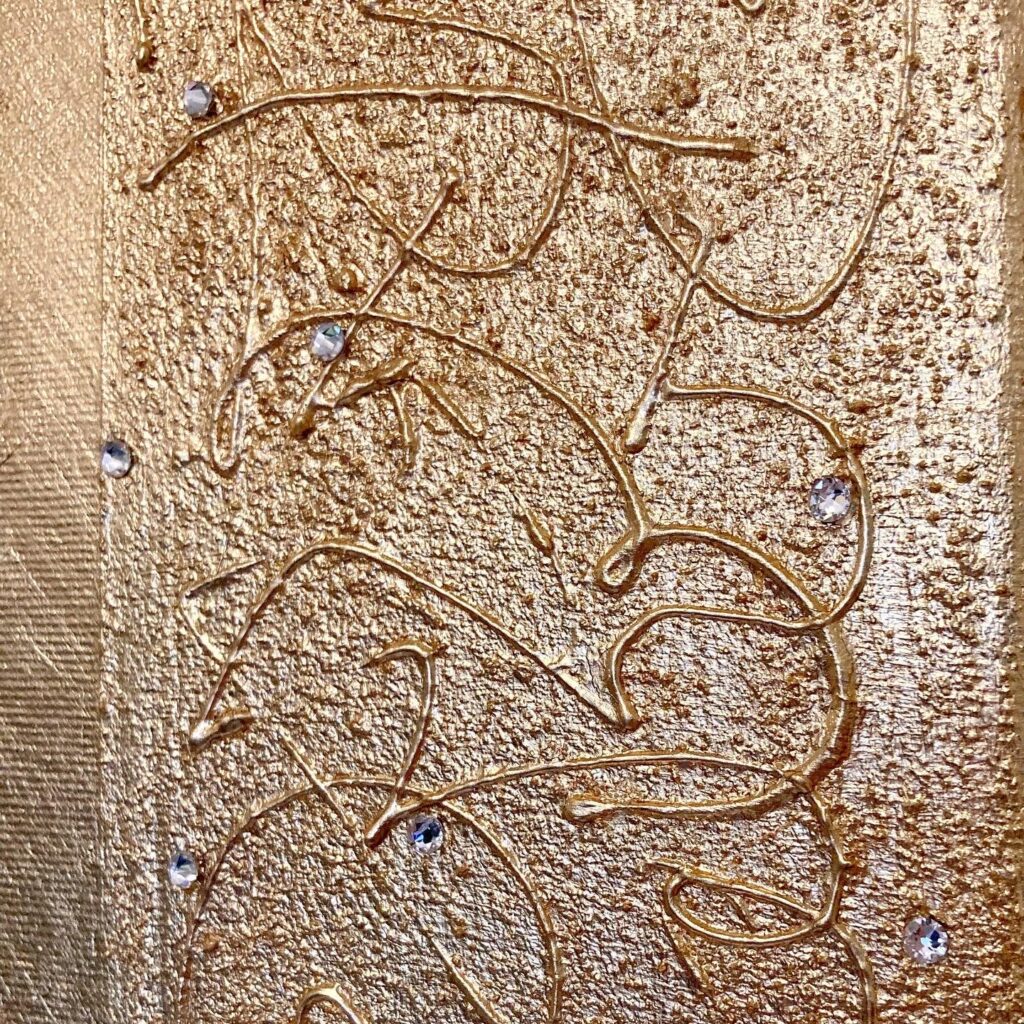 Obraz je na 3D rámu, 80 x 80cm. Kombinovaná technika, třpytky, kamínky SWAROVSKI, plátkový zlatý metal.