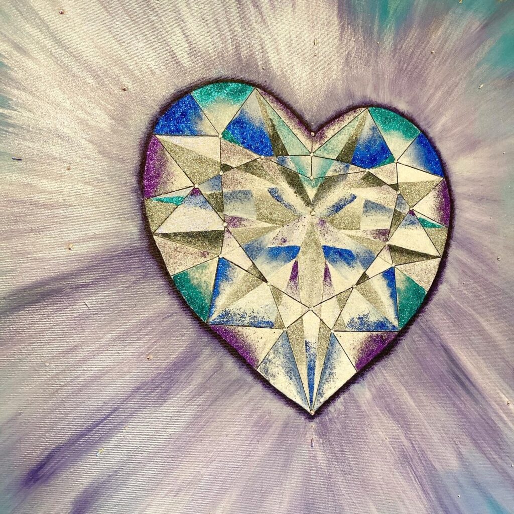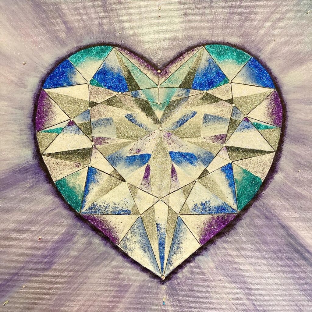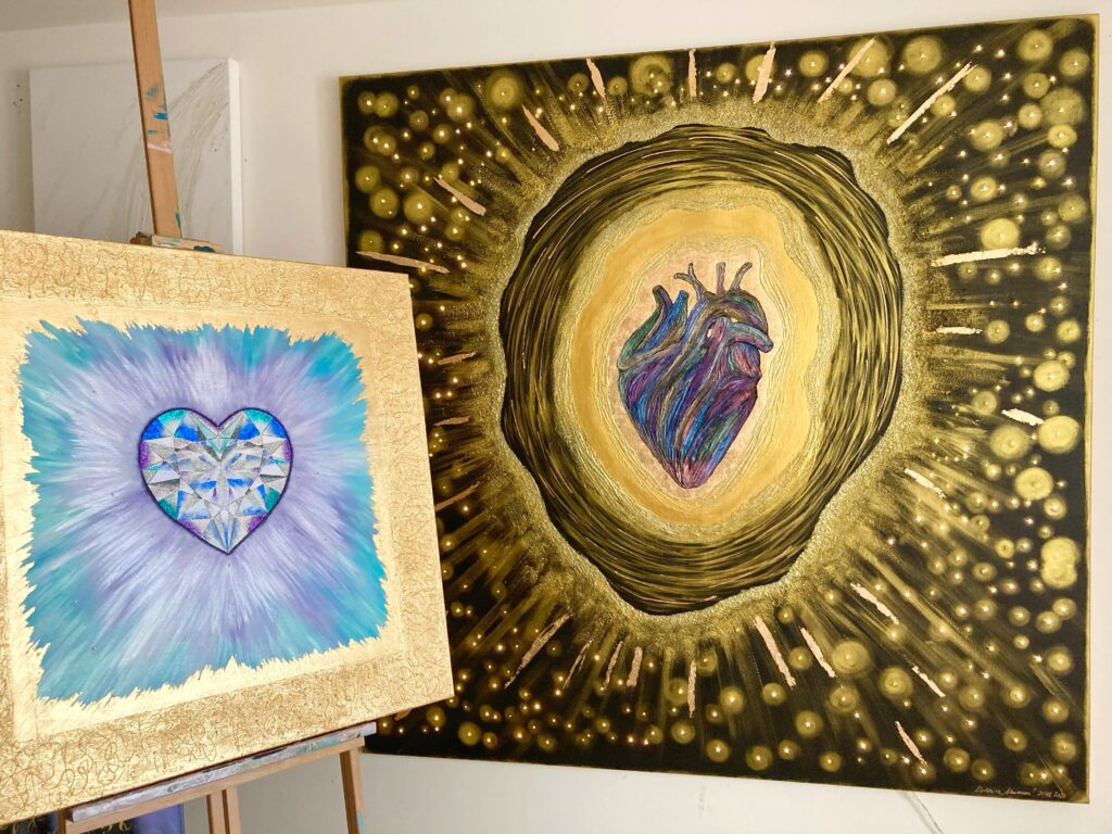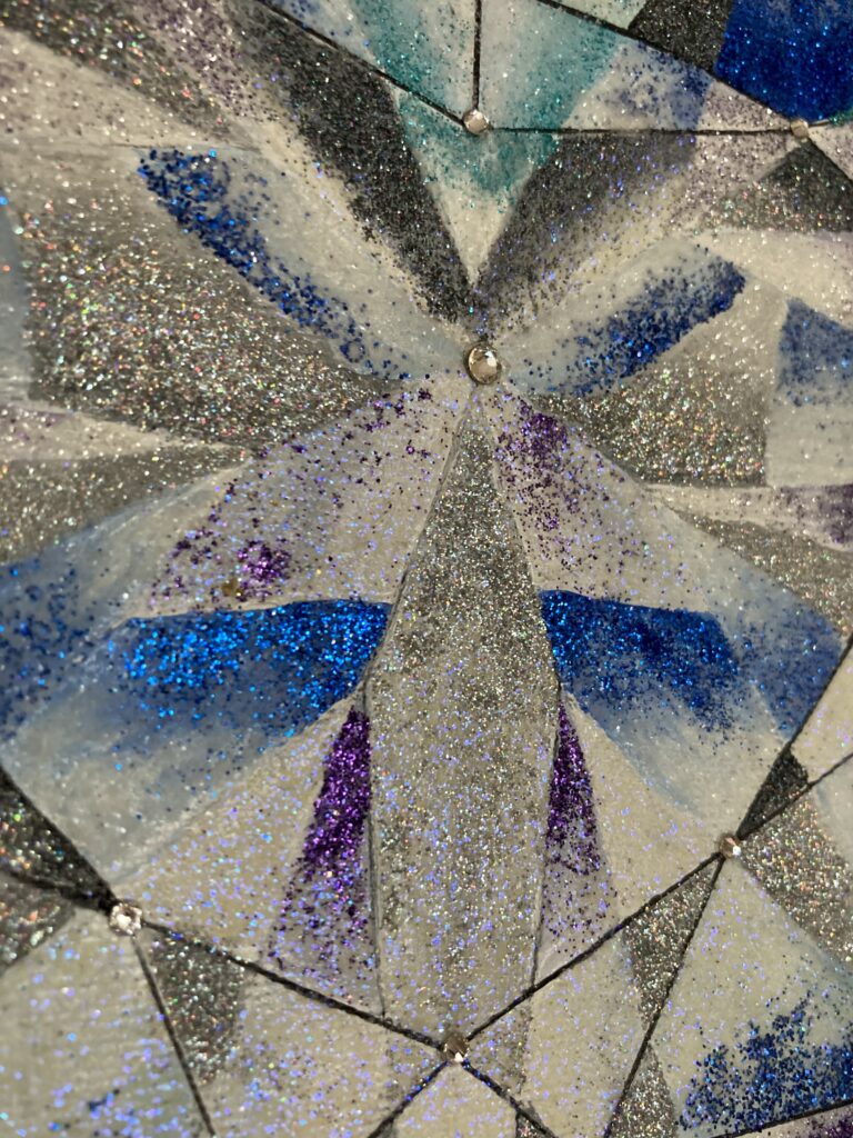 Obraz je na 3D rámu, 80 x 80cm. Kombinovaná technika, třpytky, kamínky SWAROVSKI, plátkový zlatý metal.